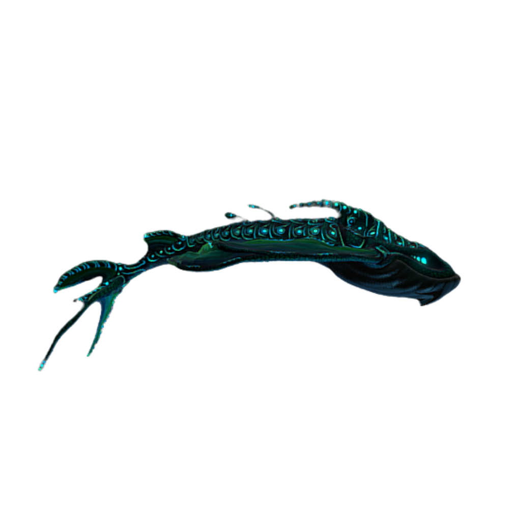 鲲已成长为巨大的、威严的鲸状生物。流动的鳍,磅礴的力量,穿行于云海之间。这是人们想象中鲲的形态——一条不可能存在的、天界的巨鱼。